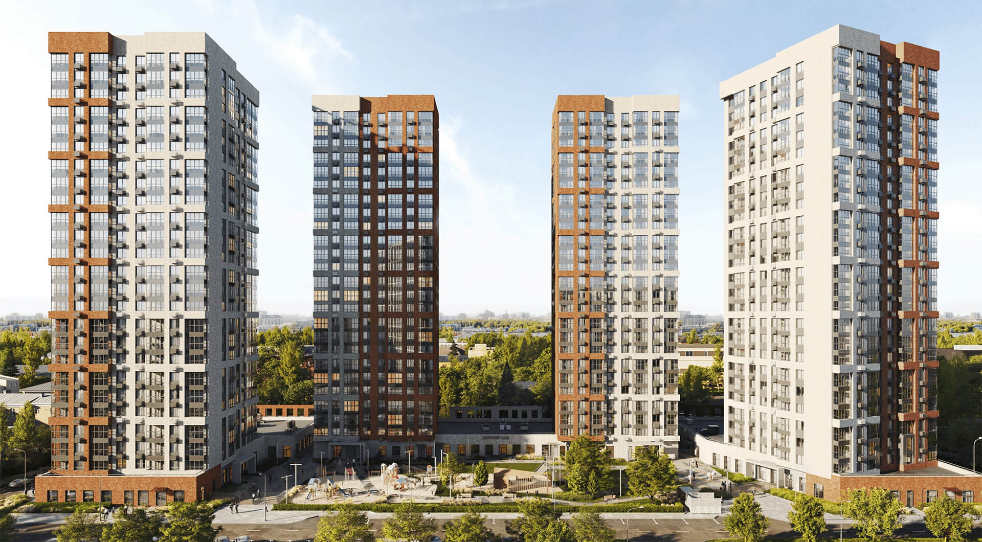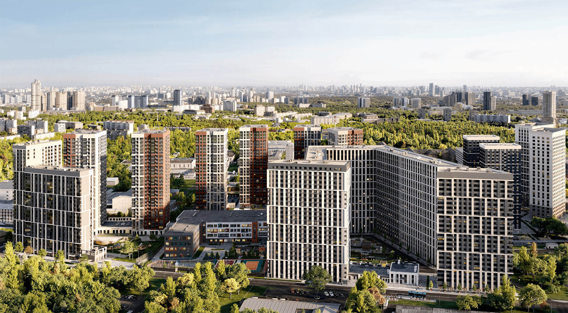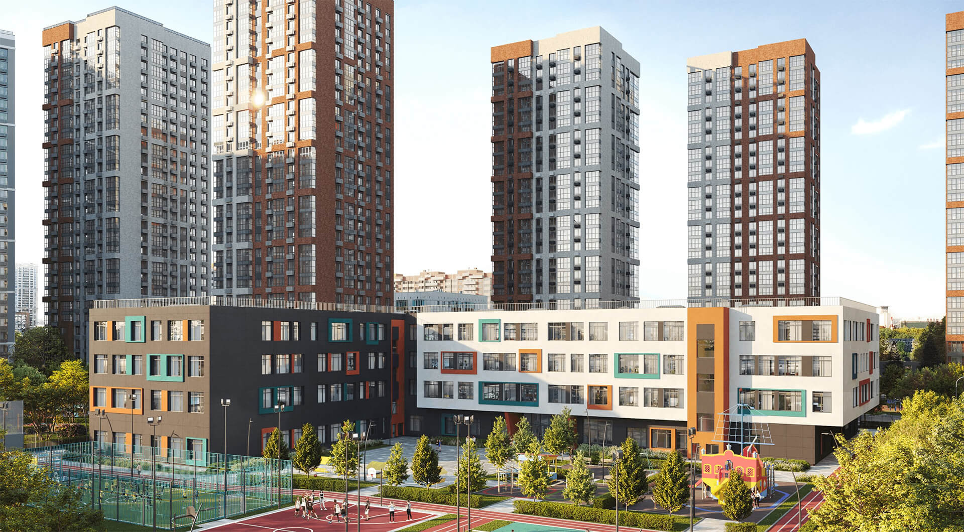 Общая архитектурная идея — создавать не просто жилые корпуса, а социальное пространство, объединяющее людей и обеспечивающее взаимодействие. Интеграция коммерческих помещений на первых этажах формирует городскую среду, а продуманное размещение школ, детских садов и поликлиники обеспечивает всестороннее развитие жителей.