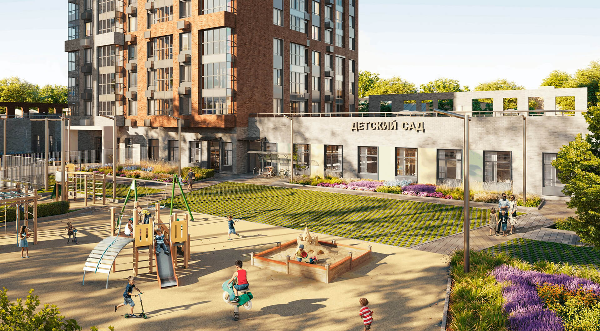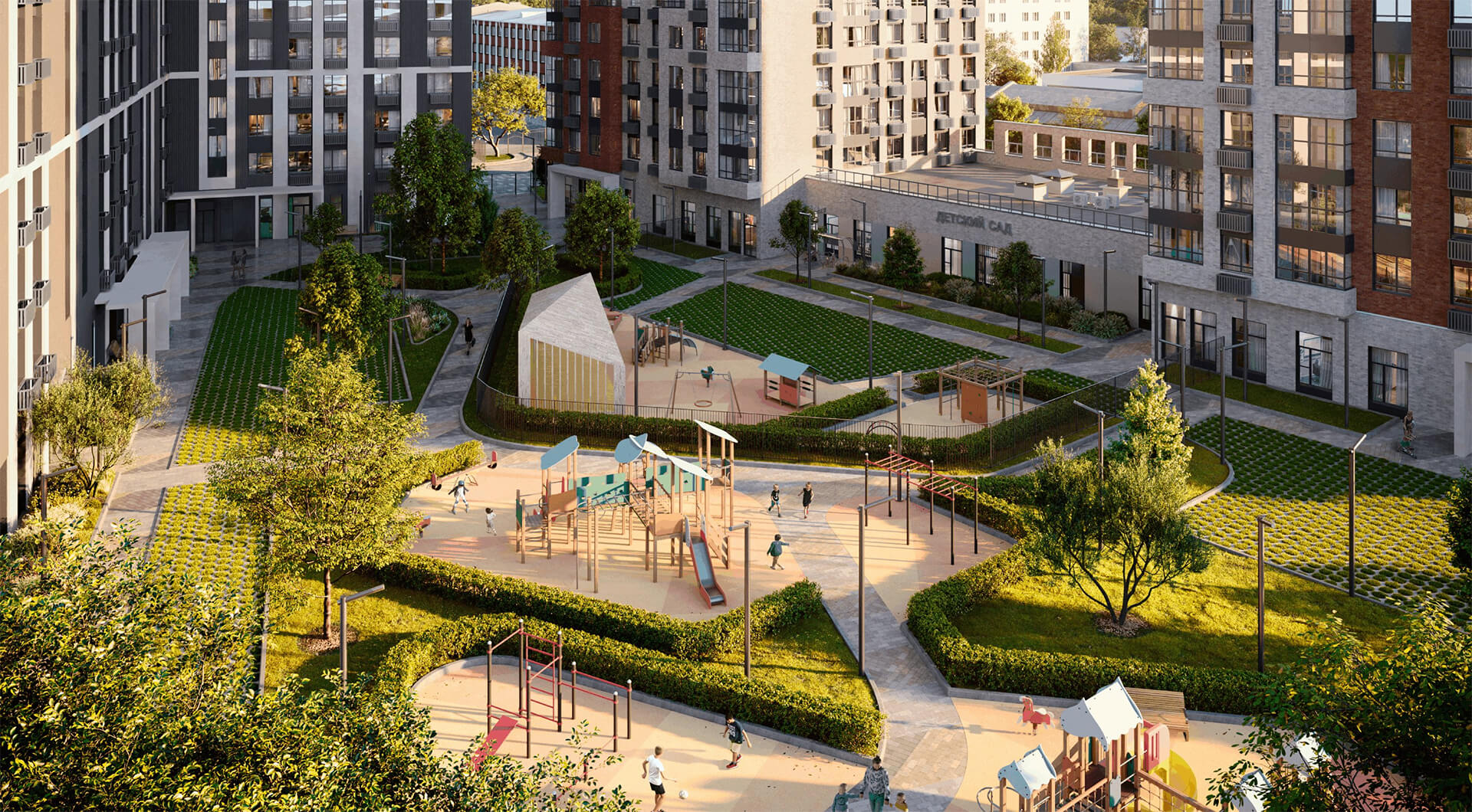 Каждая деталь благоустройства — это малая архитектура, освещение, видеонаблюдение, системы полива и скамеечки. Жилой комплекс работает как единый живой организм, где дружелюбный двор, семейная среда, клубы по интересам и мероприятия создают ощущение сообщества и повышают качество жизни.