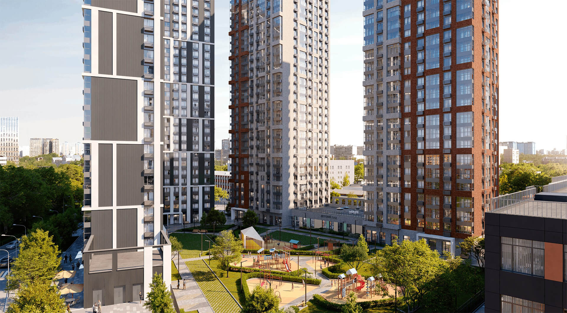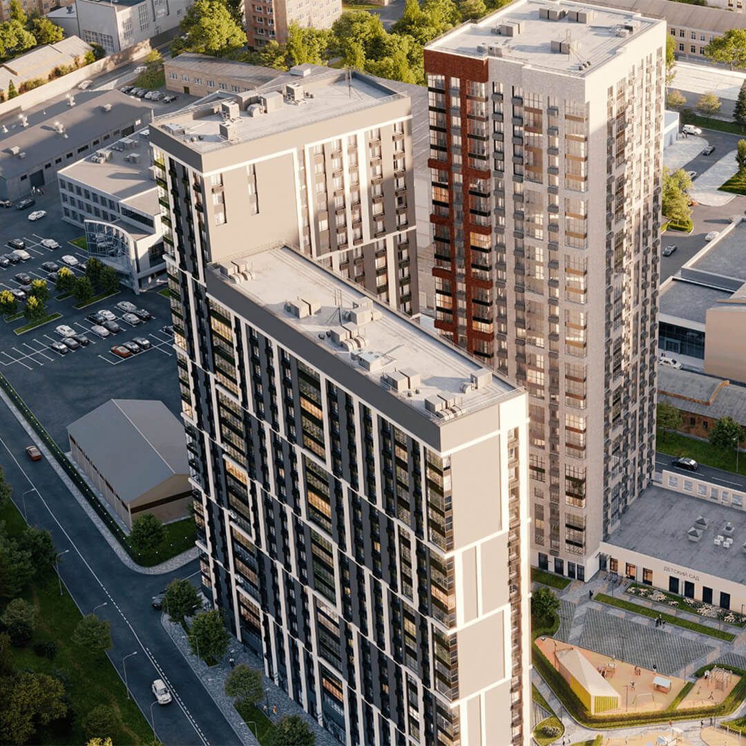 Общая архитектурная идея — создавать не просто жилые корпуса, а социальное пространство, объединяющее людей и обеспечивающее взаимодействие. Интеграция коммерческих помещений на первых этажах формирует городскую среду, а продуманное размещение школ, детских садов и поликлиники обеспечивает всестороннее развитие жителей.